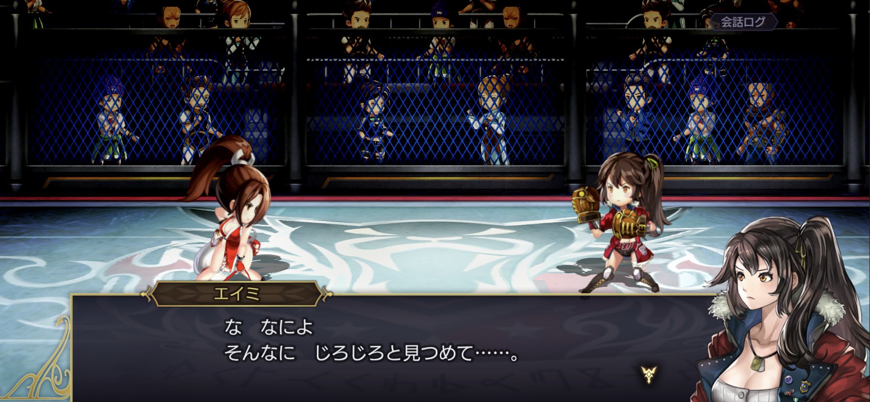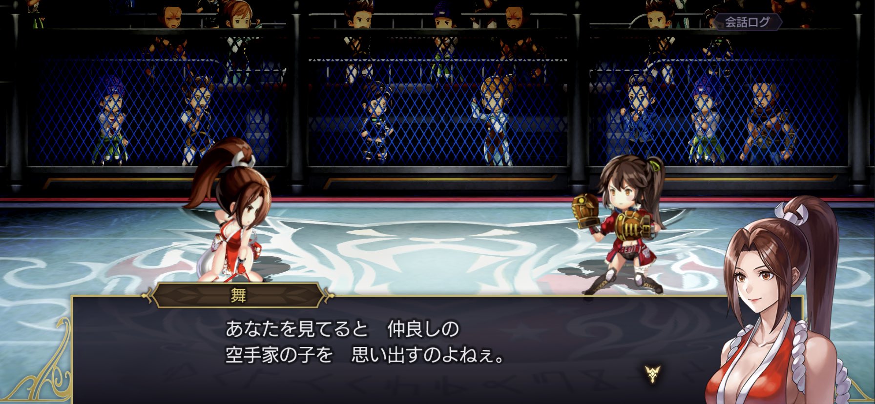 ユリは本作には直接登場はしませんが、「KOF」コラボで登場した不知火舞が、元気なファイター・エイミを相手に、ユリの印象を重ねてほっこりする場面が描かれています。